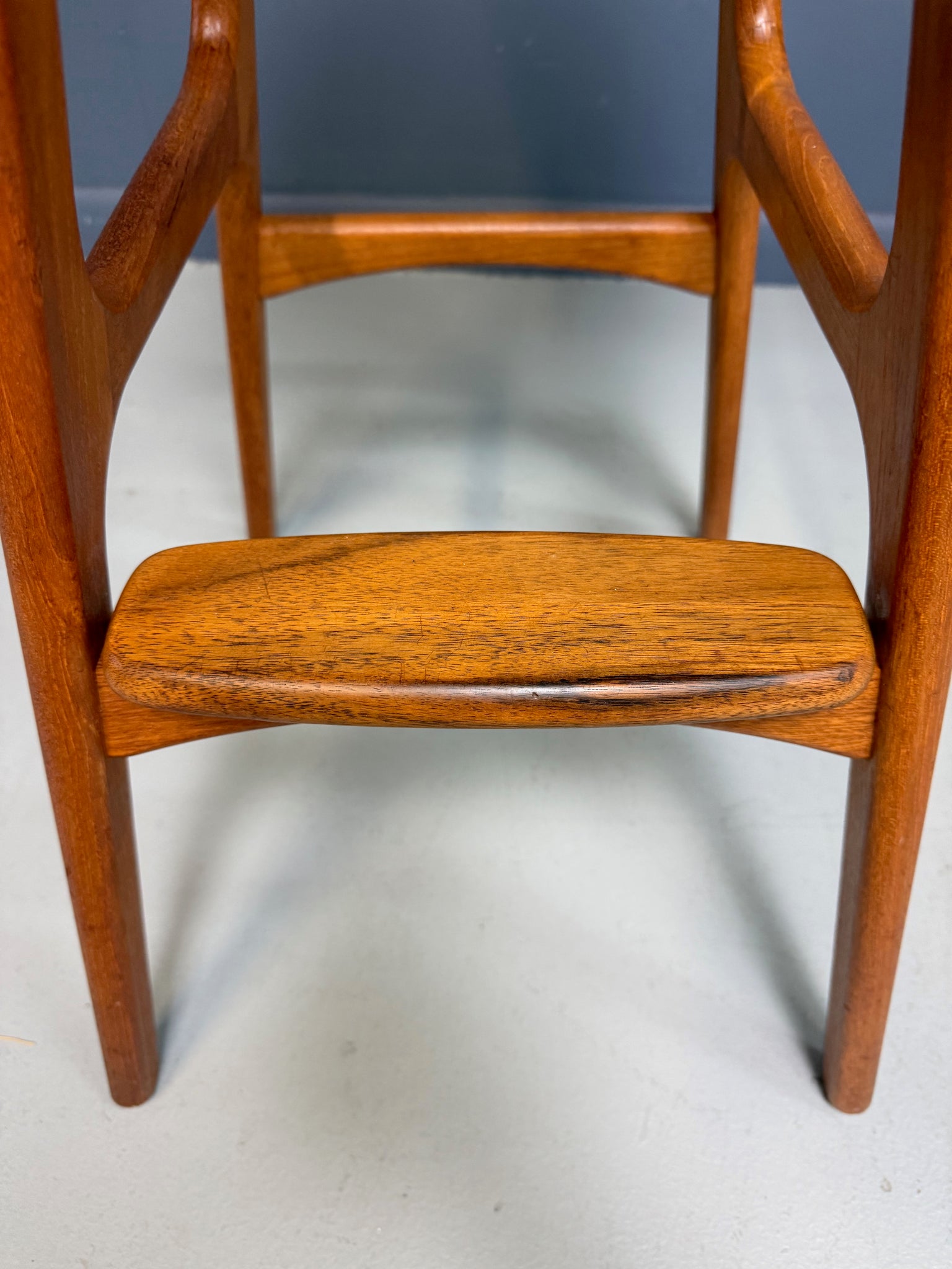 This elegant trio of mid-century bar stools, designed by Danish furniture maker Eric Buch, showcases the sculptural refinement and ergonomic sensibility that define his work. Crafted in rich solid teak, each stool features Buch’s signature organic A-frame silhouette, softened edges, and beautifully contoured stretchers that add both strength and visual lightness. Elevated and graceful from every angle, this set exemplifies classic Scandinavian craftsmanship and makes a striking addition to any kitchen island, bar, or design-forward interior.