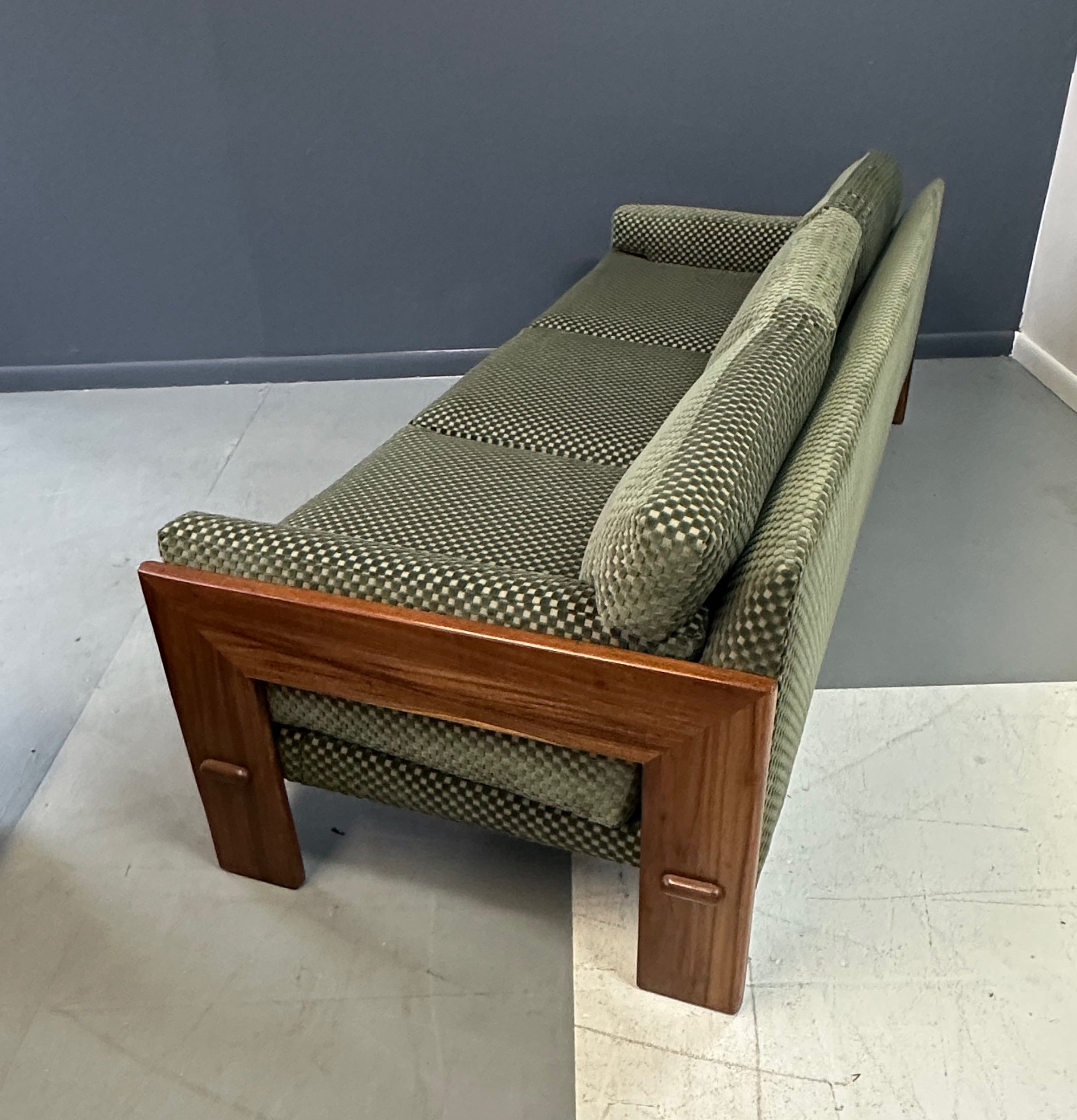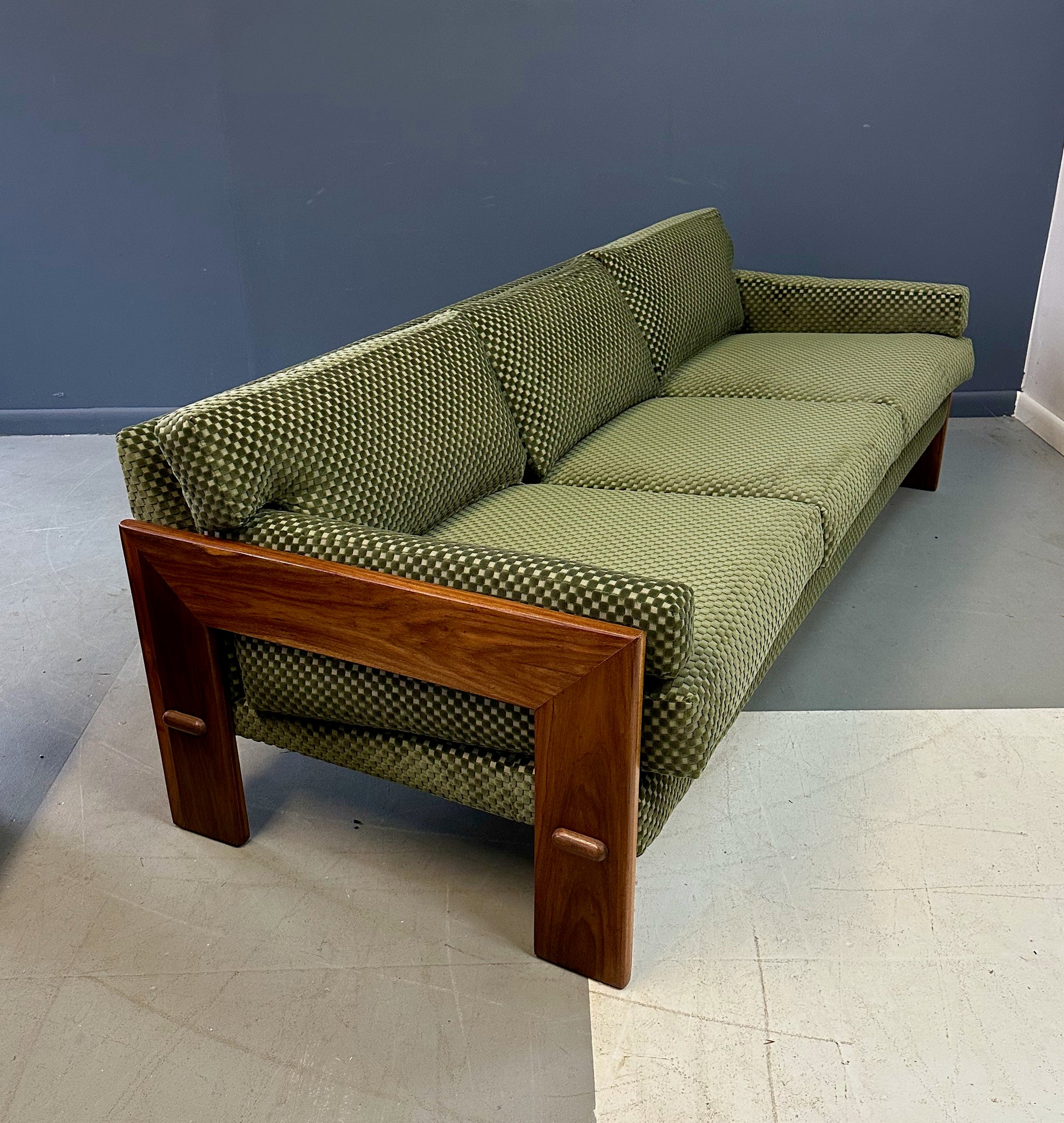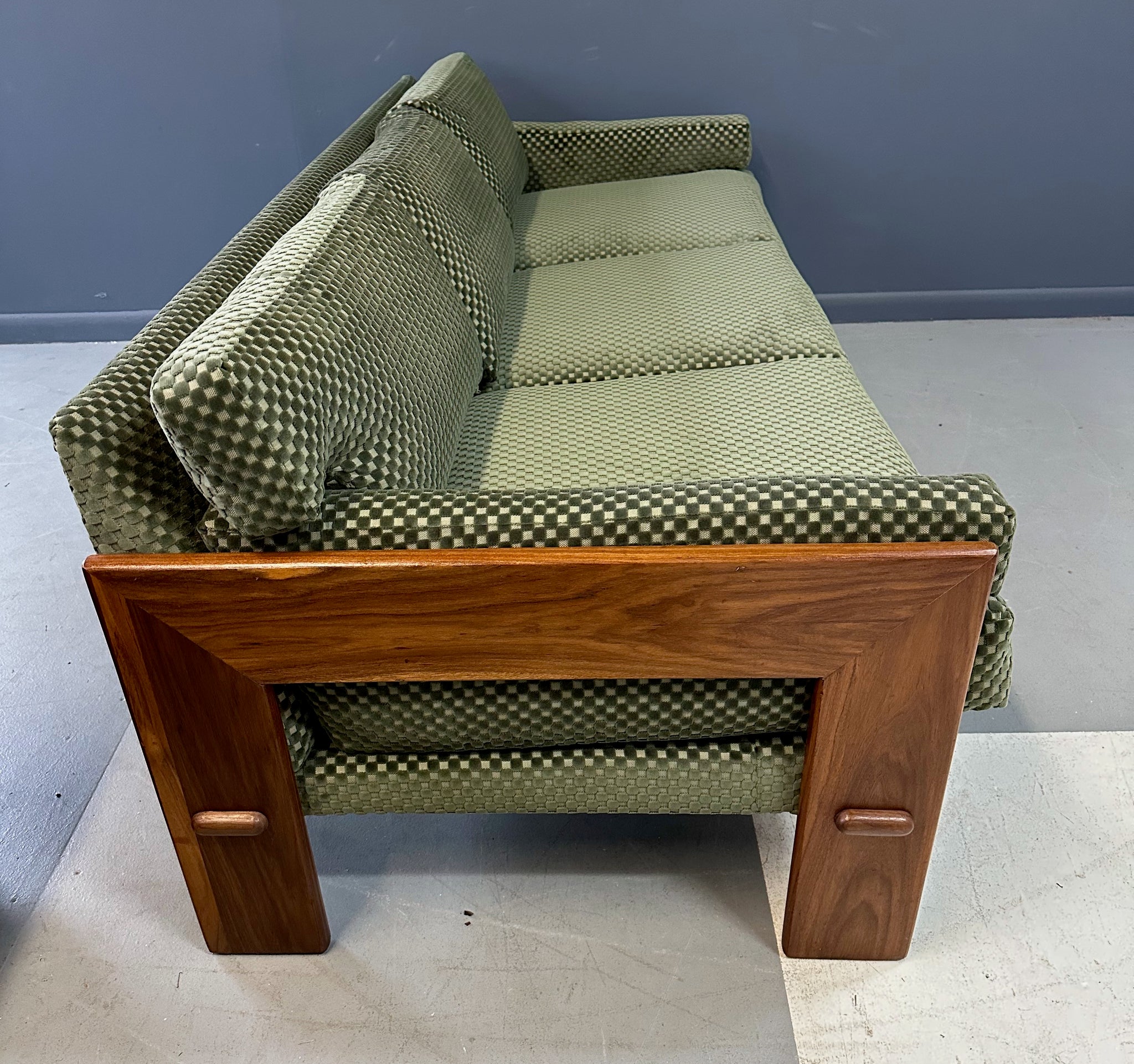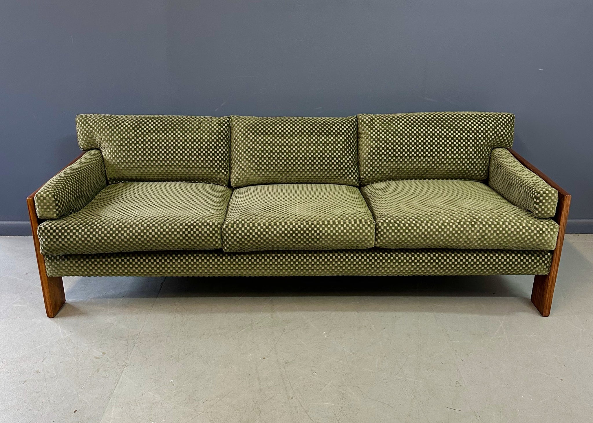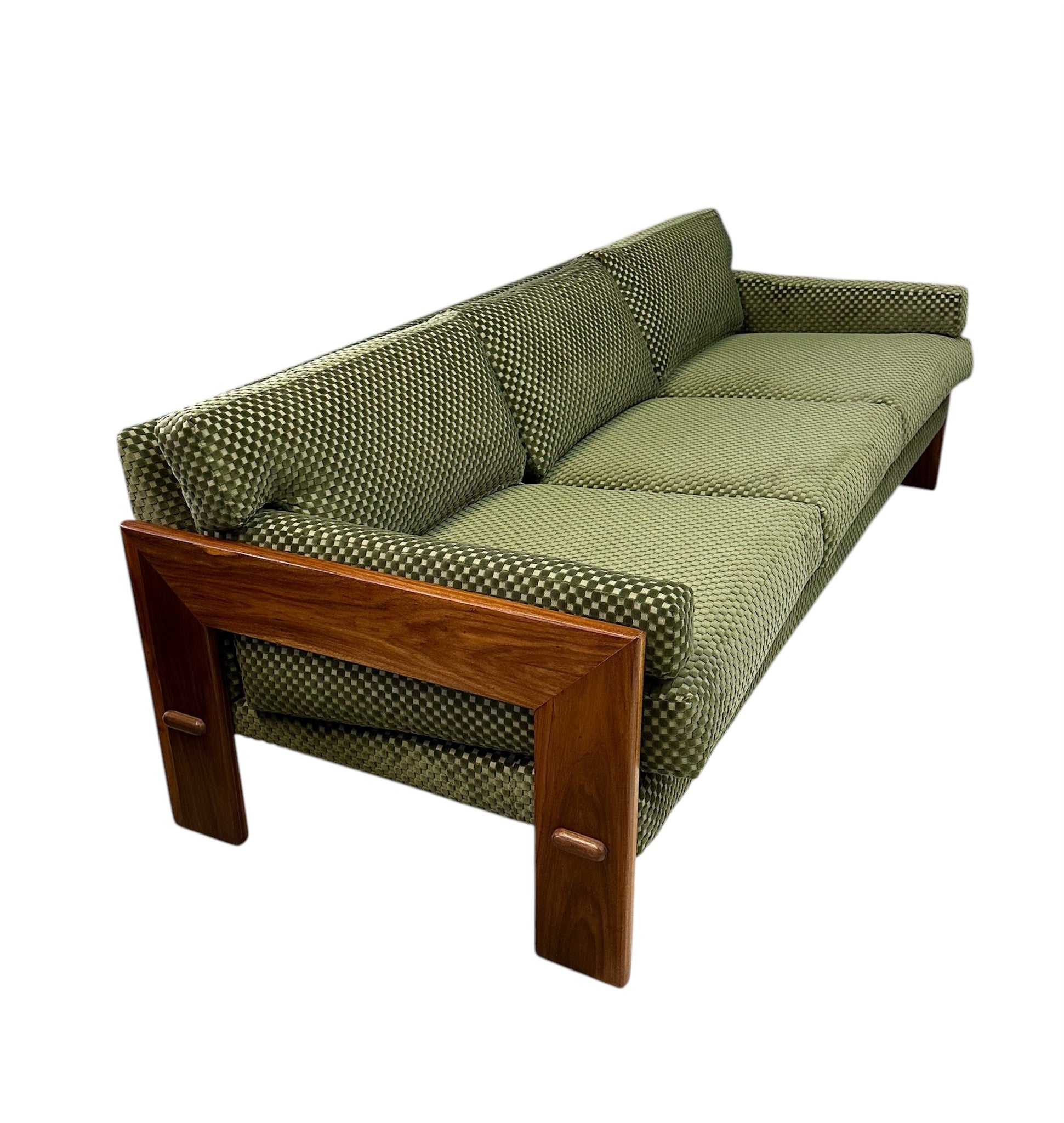 Reupholstered. Refinished. Wear consistent with age and use. Newly refinished and reupholstered in a green checkerboard velvet this is a beautiful and extremely comfortable sofa.