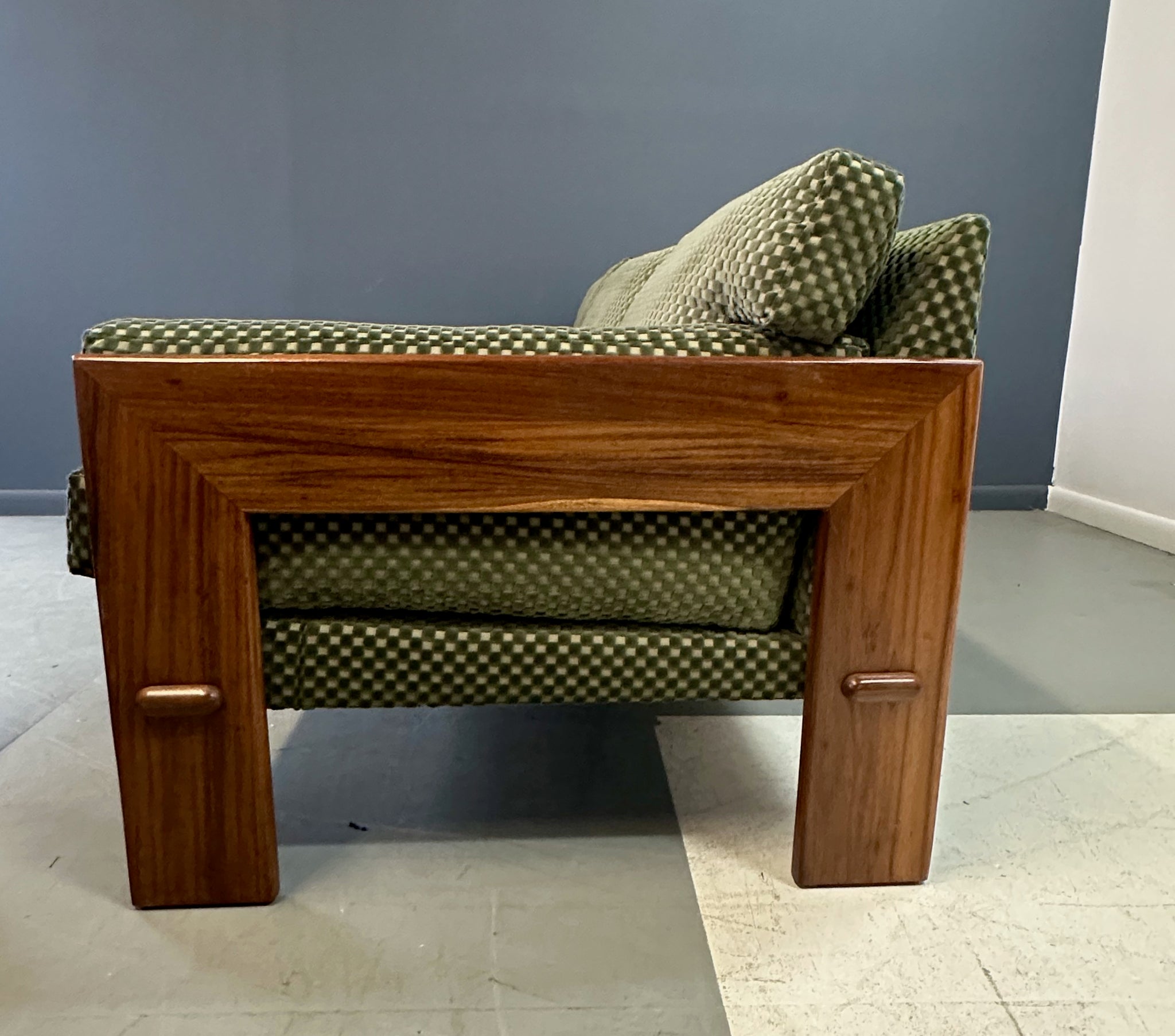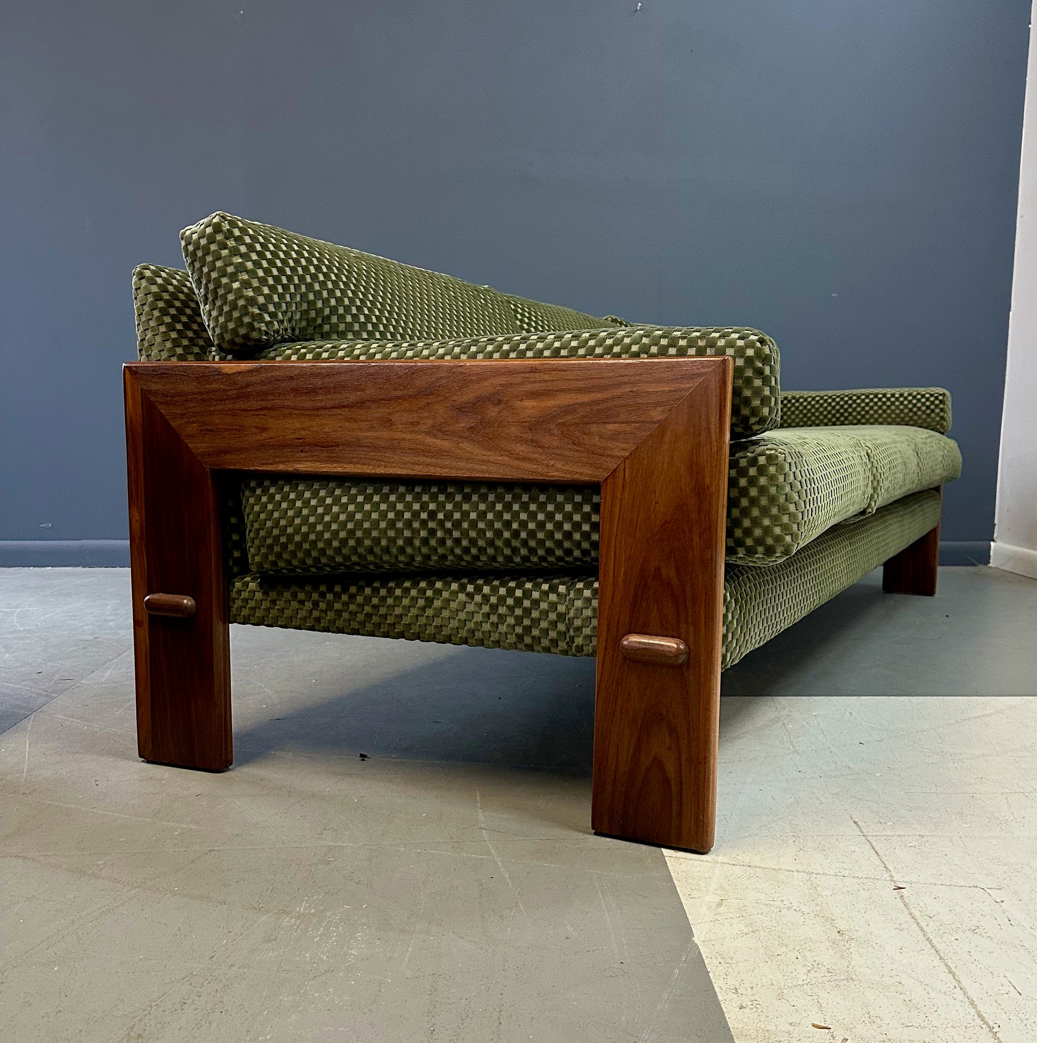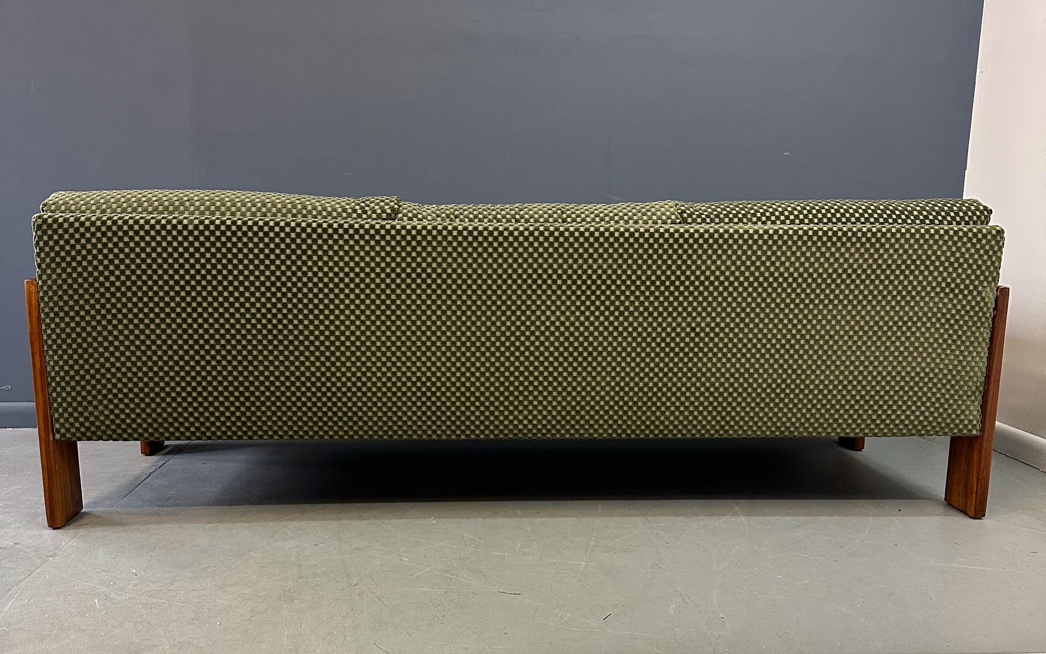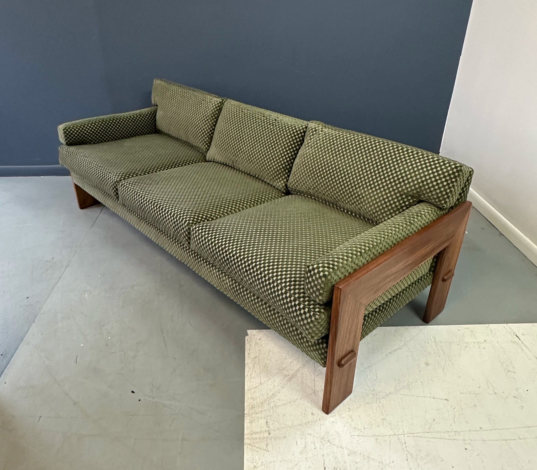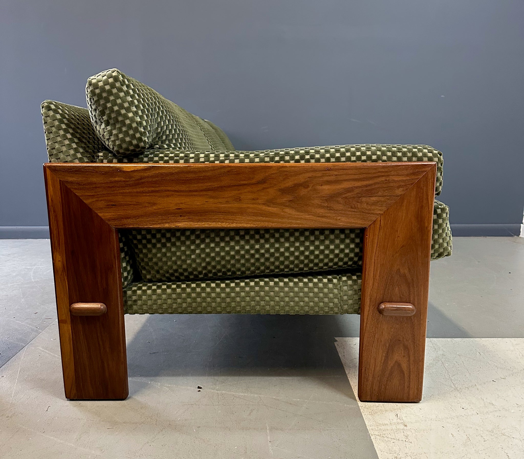 Reupholstered. Refinished. Wear consistent with age and use. Newly refinished and reupholstered in a green checkerboard velvet this is a beautiful and extremely comfortable sofa.